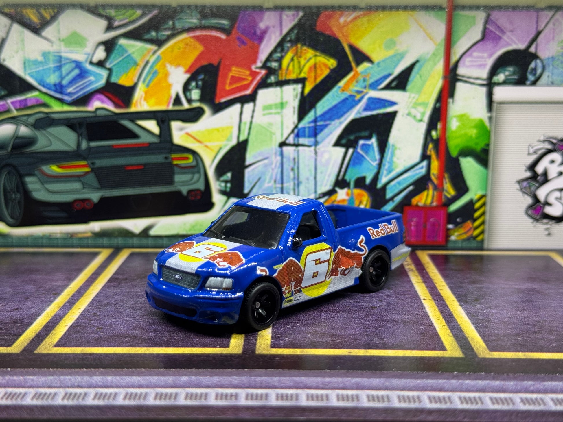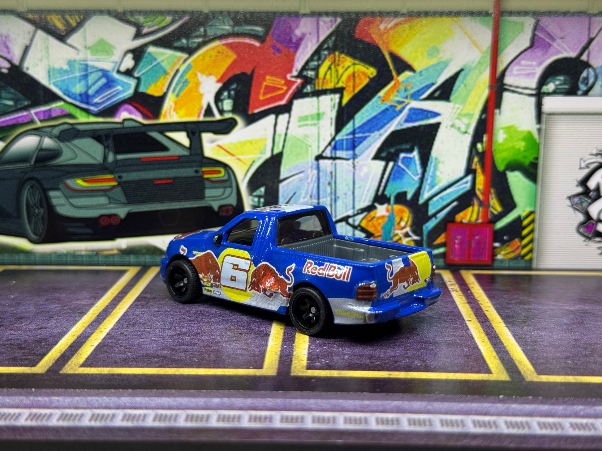 Custom Ford F150 Lightning. This Lightning has been painted a gloss blue and rocking some Redbull decals. Will come in a custom display case.