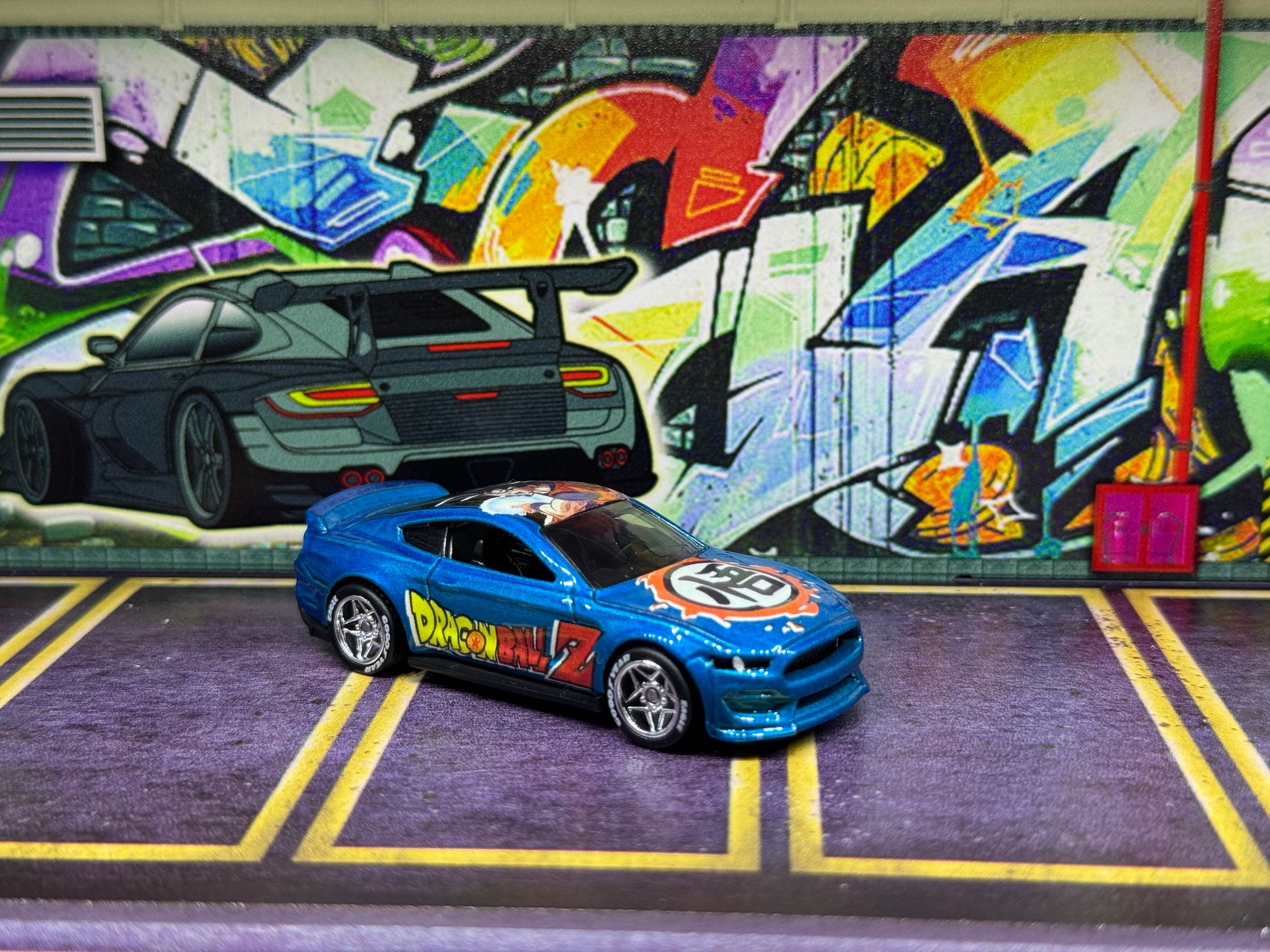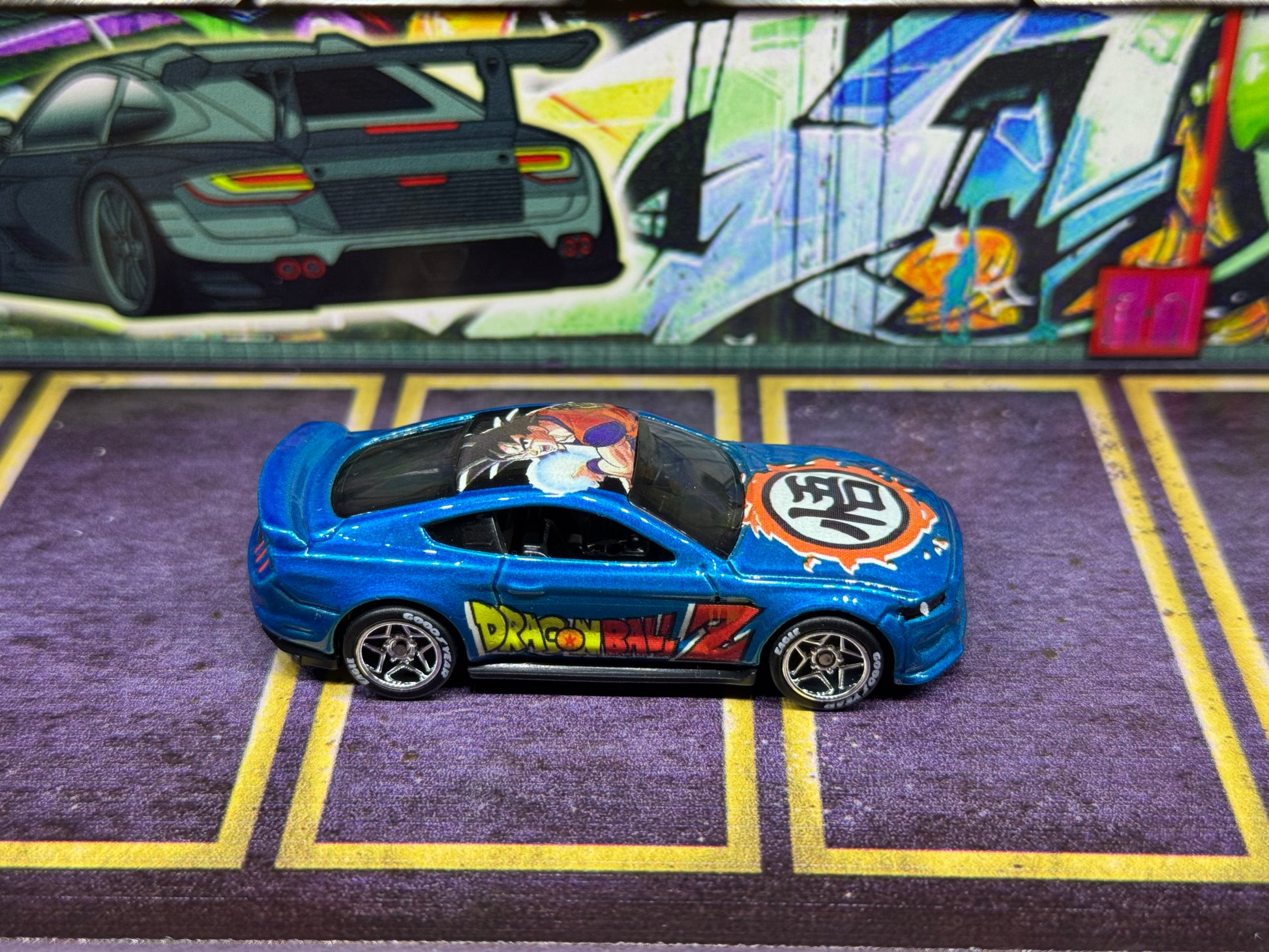 Custom Hot Wheels Ford Mustang. This Mustang has been painted blue and rocking some Dragon Ball Z decals. Will come in a custom display case.