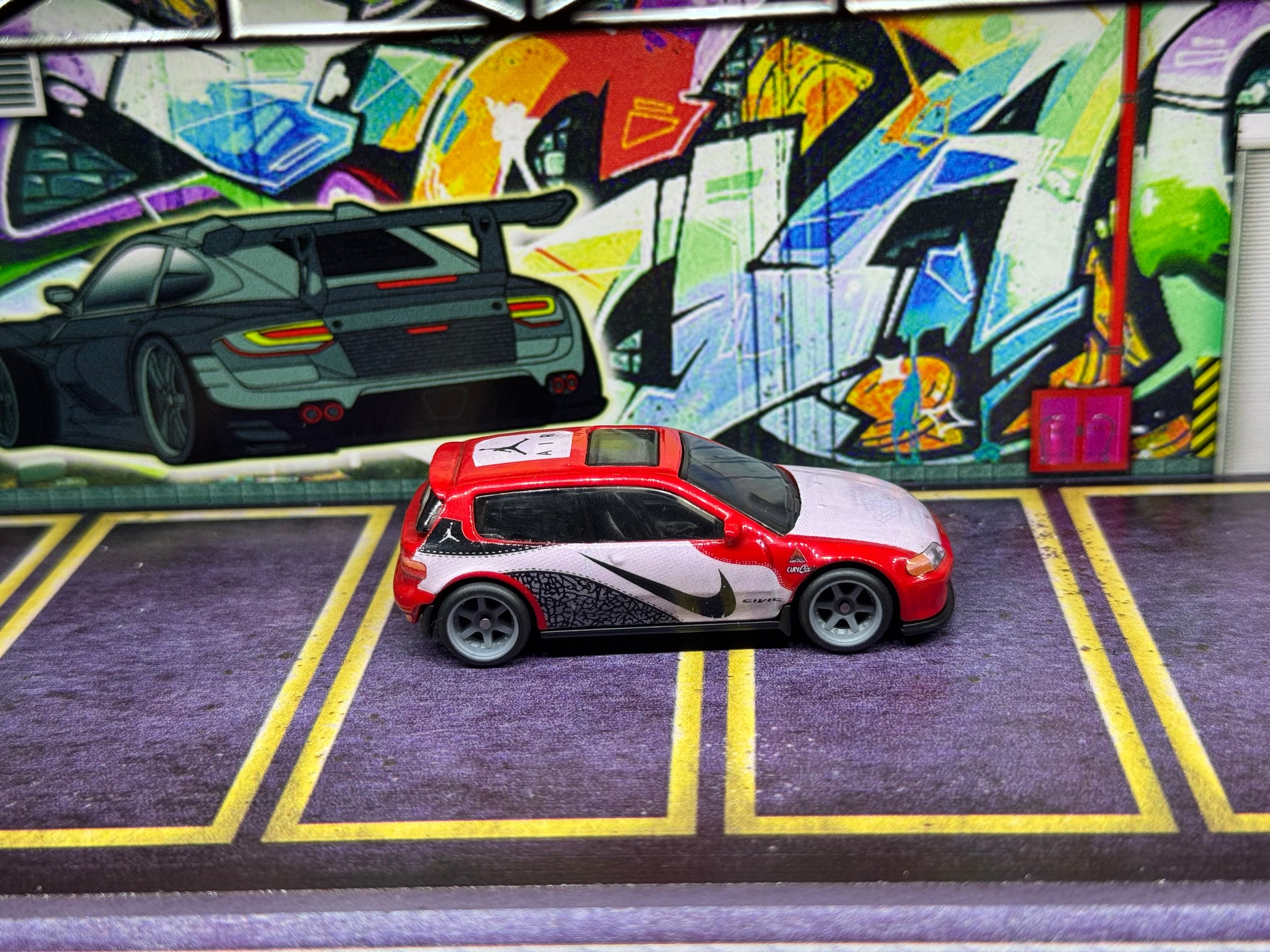 Custom Hot Wheels Honda Civic EG. This EG has been painted a gloss red and rocking some Nike decals. Will come in a custom display case.