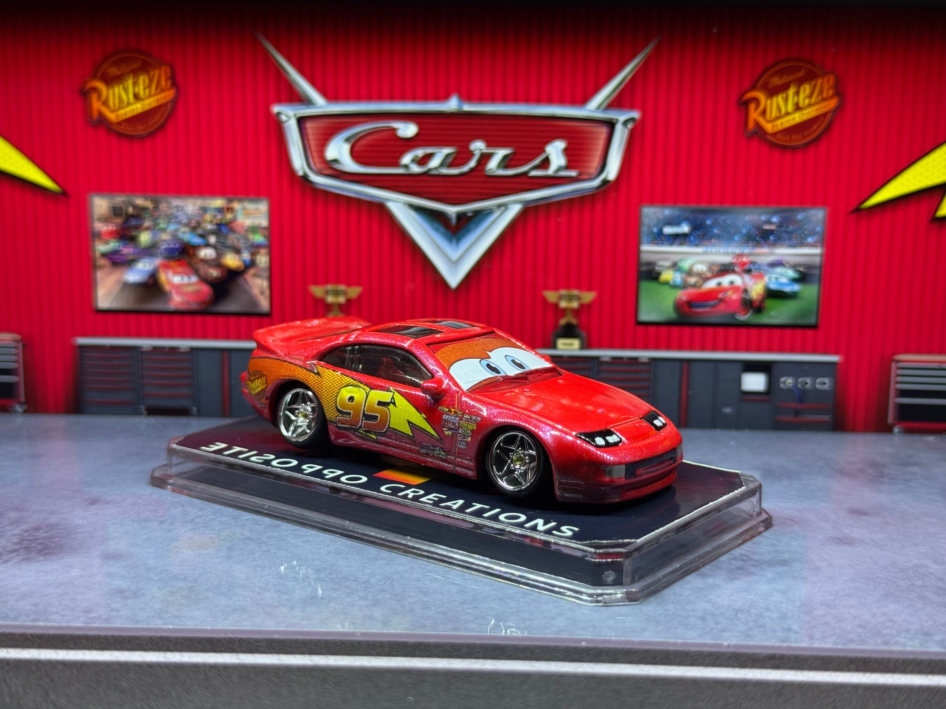 Custom Nissan 300ZX. Painted red and rocking McQueen decals. Car is slightly lowered and rocking real rider wheels! Will come in custom display case.
