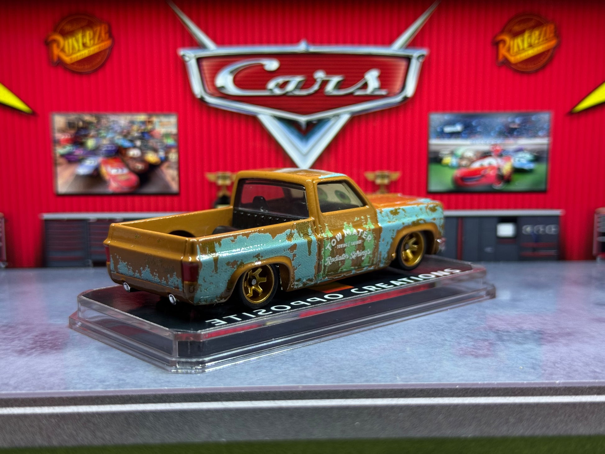 Custom Tow Mater 83 Chevy Silverado. This version has copper colored wheels. Will come in a custom display case.